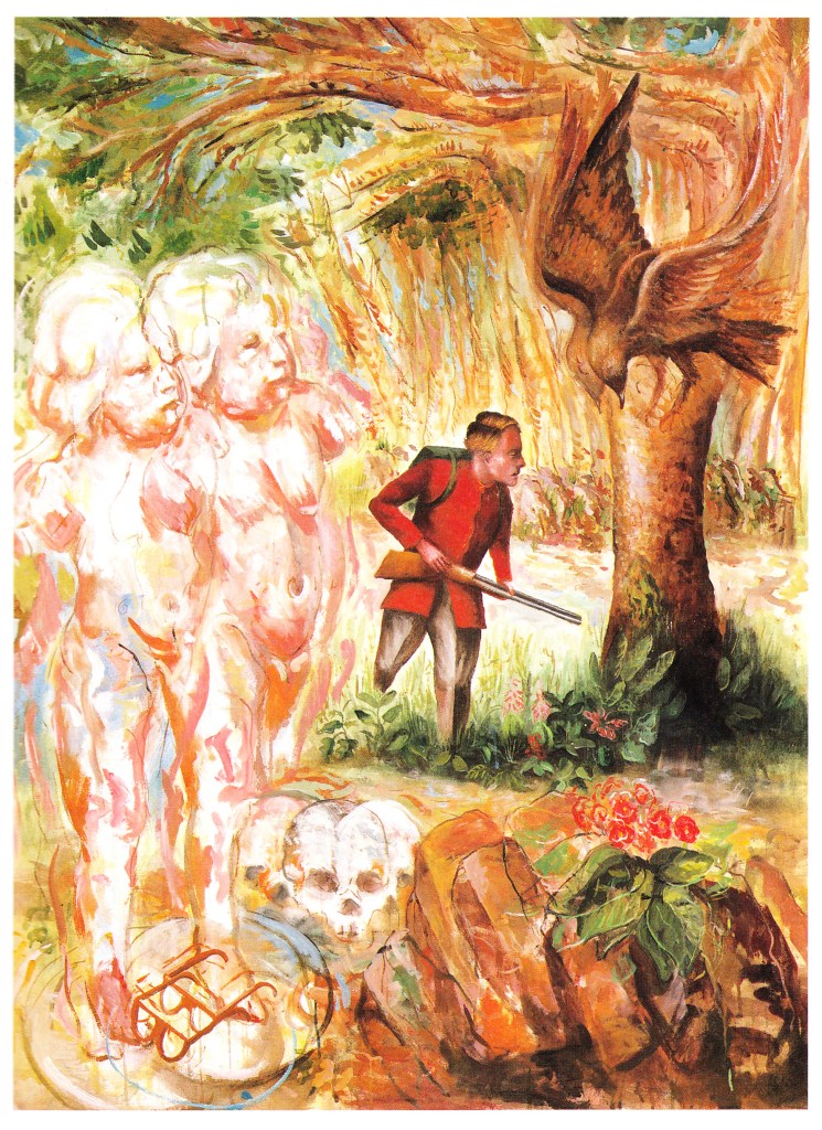 By including this cupid, Campbell’s poking fun at both himself and other artists who attempt to reference the history of ‘great art’ – hunting blindly, like the myopic hunter character here, for some sort of meaning, with the result that they often get lost.