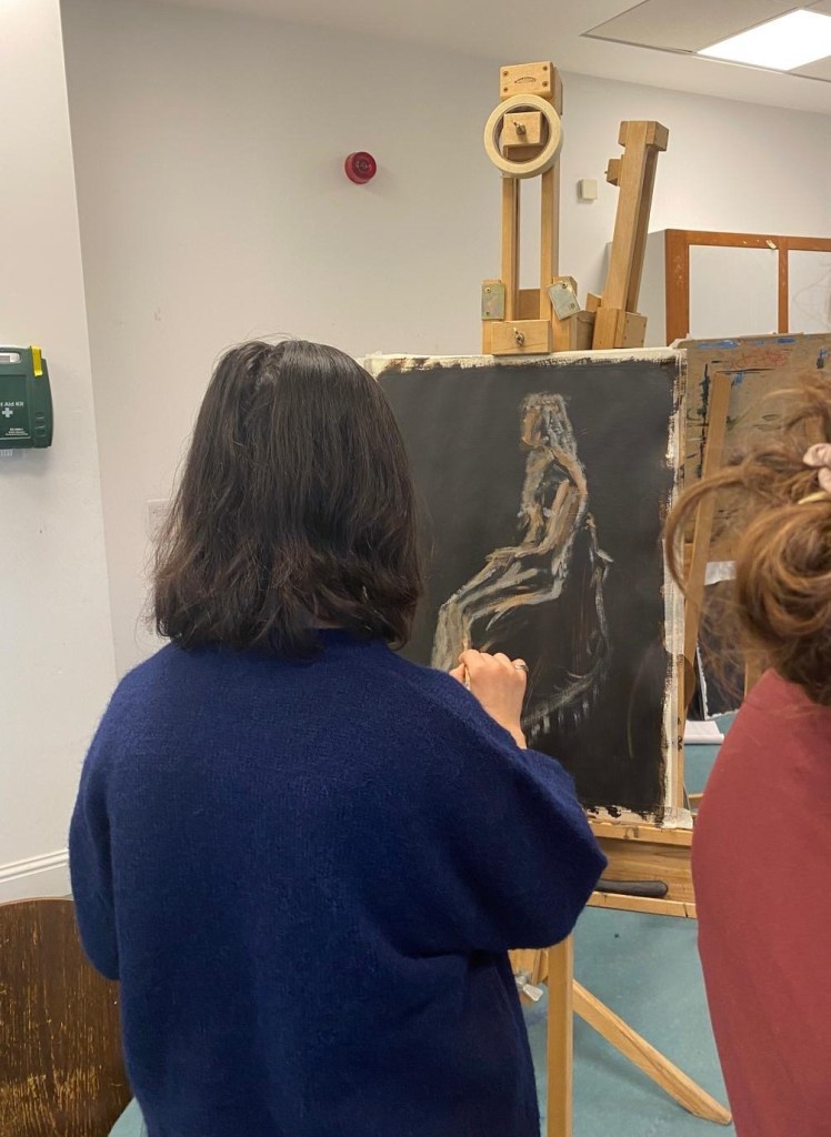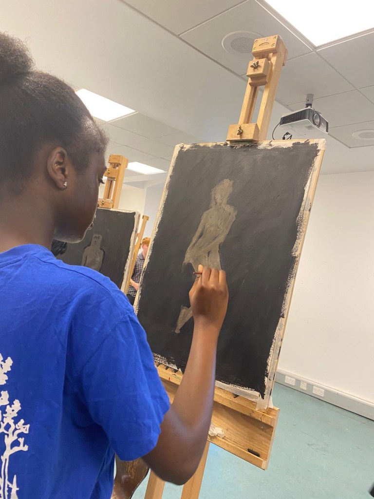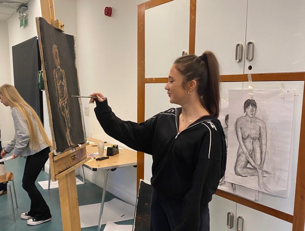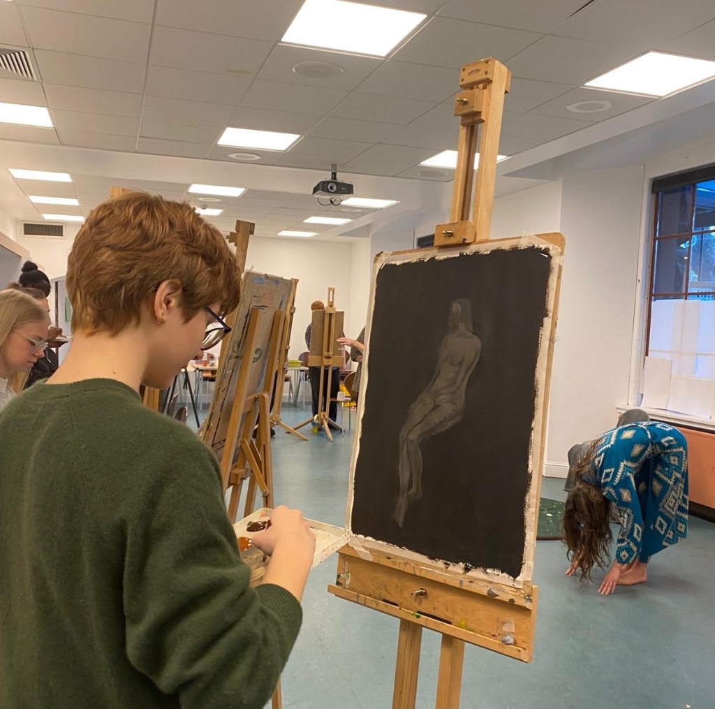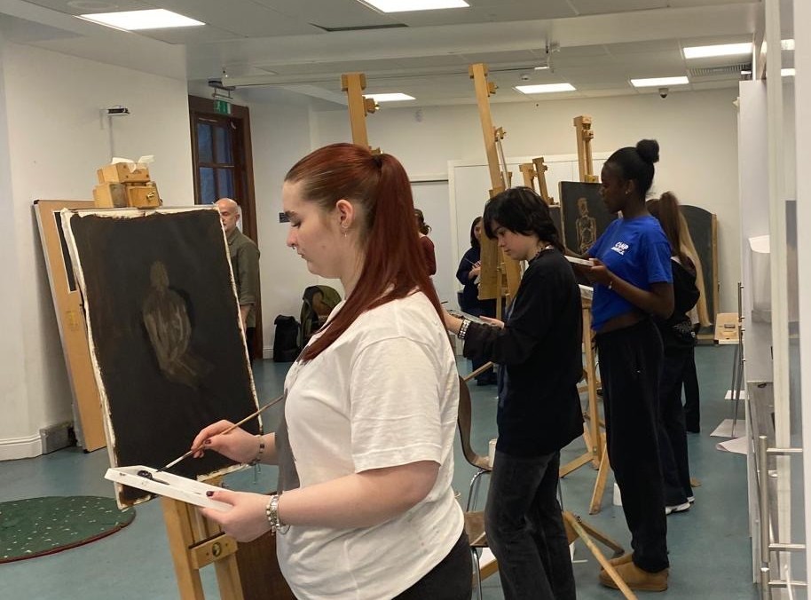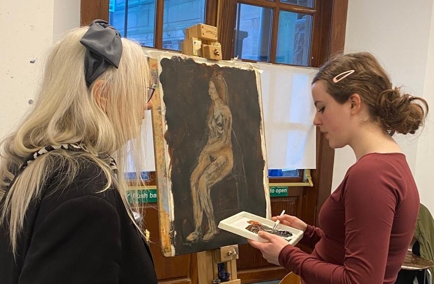 This year, artist Sandy Grant led an intensive two-day life-painting workshop at the Kelvingrove Art Gallery and Museum for pupils from 8 schools, including Hillhead High, Holyrood Secondary, St Paul’s High, Rosshall Academy, Springburn Academy, St Mungo’s Academy, St Thomas Aquinas Secondary, and Hyndland Academy.