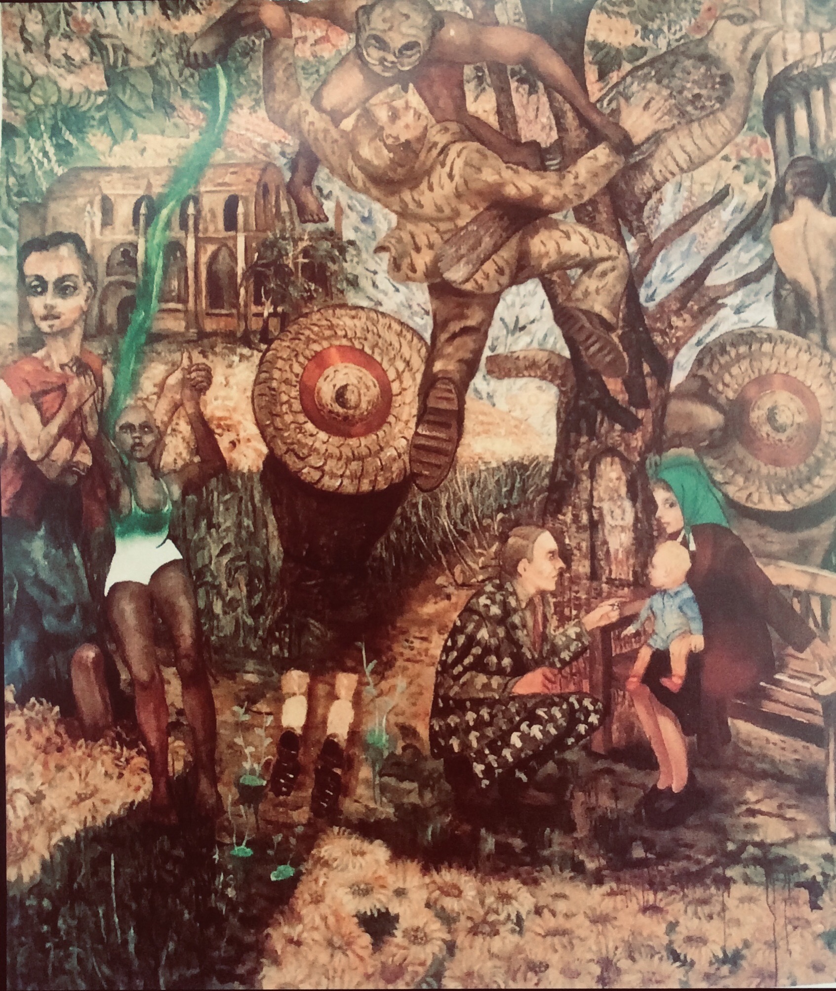 The above painting is called Hunt Falling. Falling is an in between state: you’re neither up nor down – and in a sense Hunt is always suspended like this, between good and evil. According to Campbell, Hunt got drawn into Nazi-ism because he was misguided, and his ‘Fall’ is his moral despair when he realizes, too late, his mistake.
