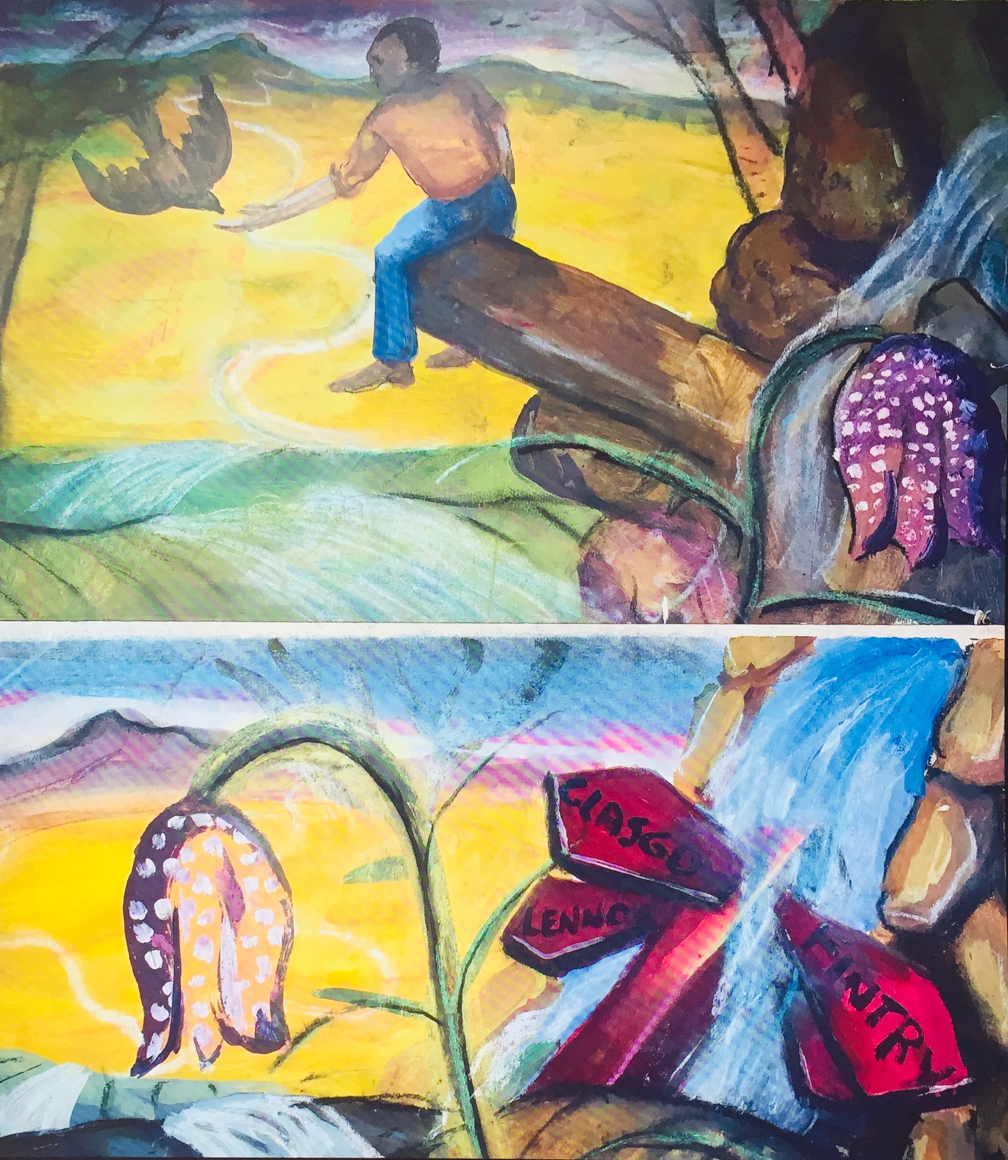 The two sketches shown here both feature fritillaries which are a nod to Mackintosh but also to the fact that they grew wild in the ground surrounding our farmhouse in the Fintry hills. The signpost was a leitmotif in Steven’s earlier work based around his invented character Hunt and often depicted Oxford to Salisbury, but in this case shows directions to areas surrounding our then home. The background hills are the view that Steven often painted and form part of the vista that can be seen from our Kippen home.