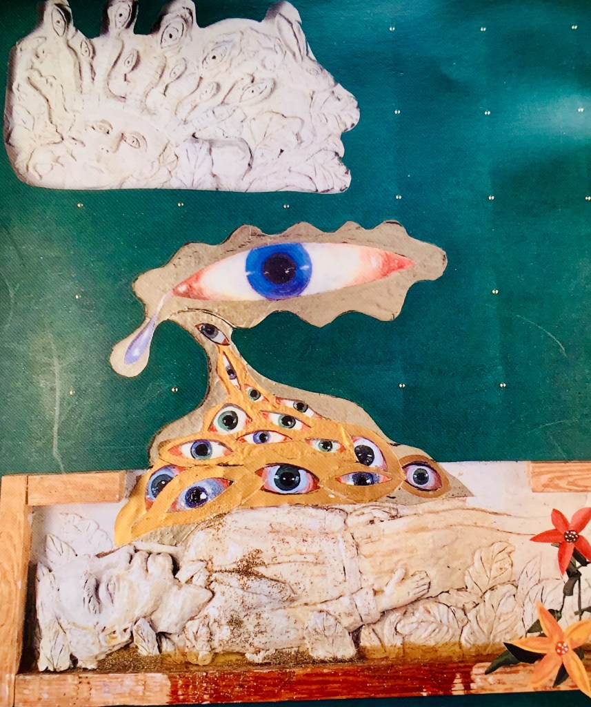 This piece was created for an exhibition called ‘Chesterfield Dreams’ at the Pier Arts Centre in Orkney in the Spring of 1996. Steven had moved away from painting at this time and had found a new fascination in working with clay, found objects, velvet and leather fabrics and a resin called (if I remember correctly) Crystal Sheen, an epoxy coating that he used on several works and continued to use even when he returned to painting. You can see how he used it in a similar way to decorate the jewel like eyes on the crown in the portrait of Joan Sutherland, a commission for the Glasgow Concert Hall.
