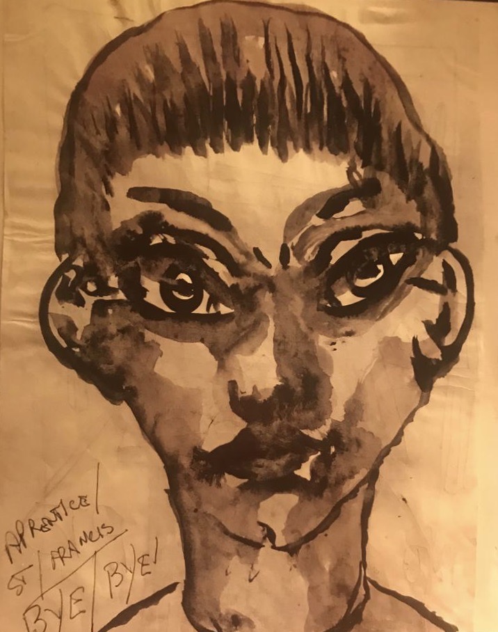 Steven has revisited his depiction of Lytton Strachey complete with cricket cap only this time he puts himself, as artist, into the central role. He has created the Pinocchio wooden boy who is resentful at the artists lack of ability to transform him completely into a physical reality.