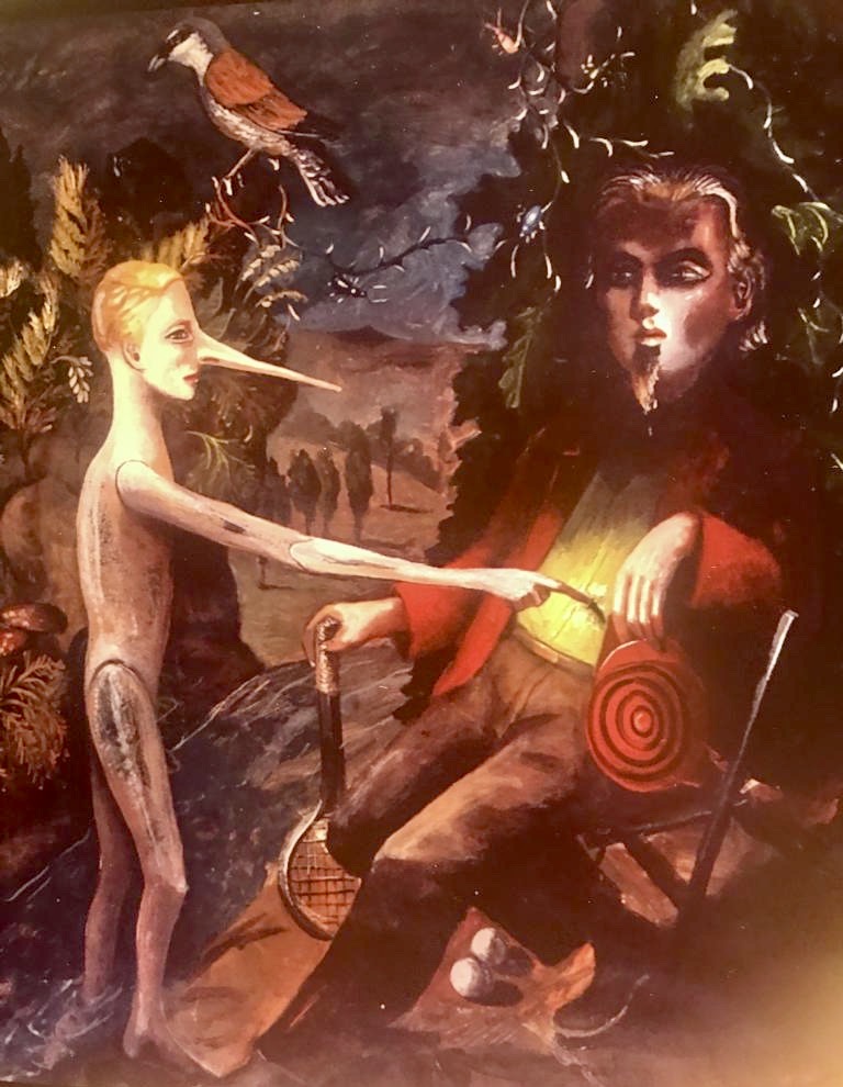 Murder mystery becomes art mystery, becomes “the myth of themselves” that Hynes identifies in his definition of the ‘charade’. Pinocchio, the Habit of the Shrike (1990) depicts a dark landscape with fir trees, a stream, toadstools at the foot of some rocks; and a figure that resembles Campbell himself, his face and upper body in semi shadow, casually yet ritualistically seated on a folded chair, his right hand resting on the handle of an upended tennis racket. A handsomely feathered shrike ( a bird that impales insects and small vertebrates on thorns or spikes, in order to tear them into more manageable pieces) perched on a briar. Meanwhile a gold haired Pinocchio figure, painted limbs scuffed and worn, his ‘liar’s’ nose obscenely and viciously extended to a sharp point, reaches out his long right arm, and impales the seated figure’s stomach with his thin, pointed finger.’ – Michael Bracewell
