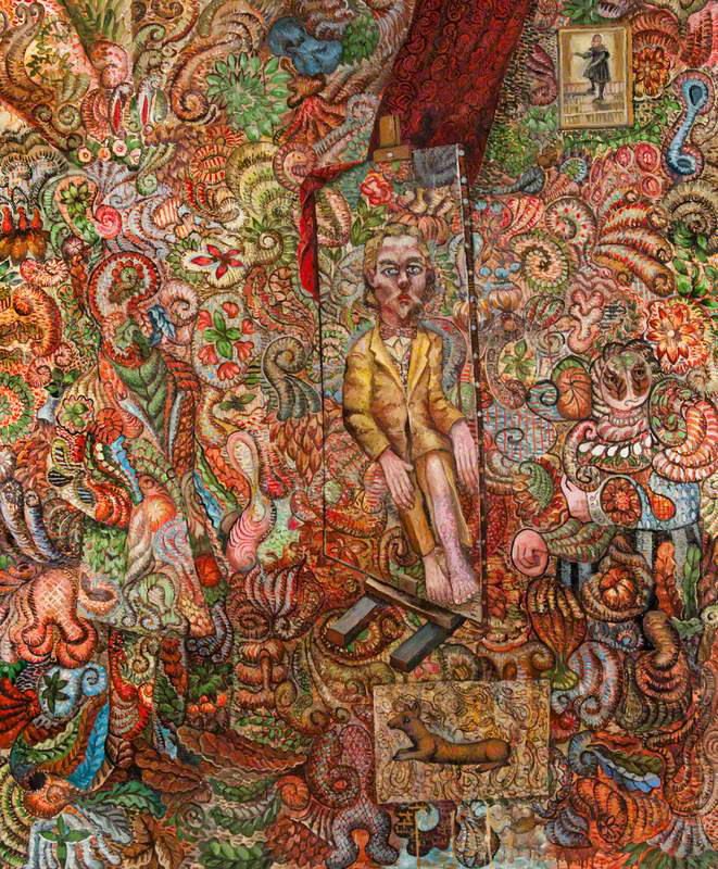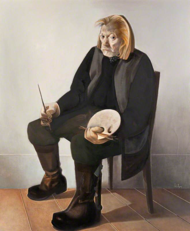 John’s life-sized painting depicts Steven as a looming solitary figure in black, seated and holding a palette and brushes. Steven’s portrait of John, Paisleycus Byrnicus Virus Invading Mr Gray, sees John at the centre of a rich Paisley pattern work, which makes reference to John’s birthplace. Both paintings are in the collection of Paisley Museum.