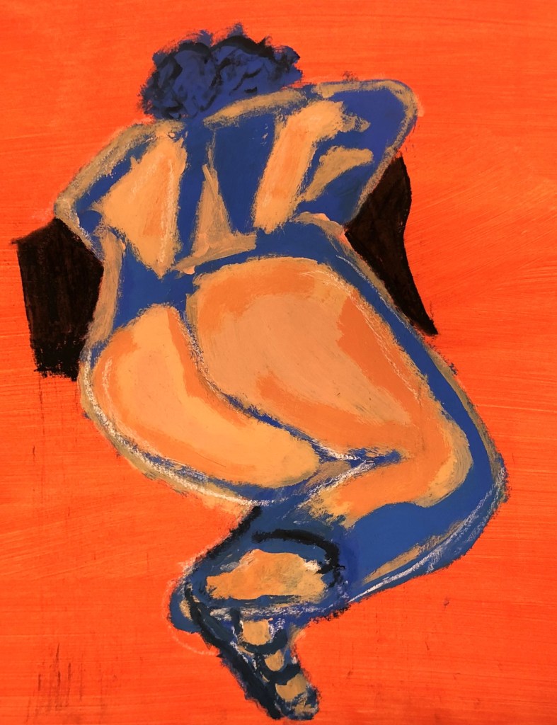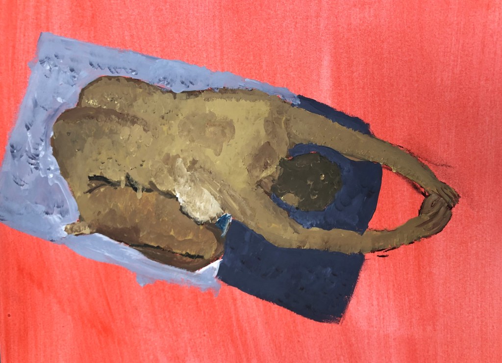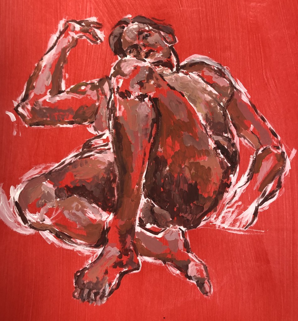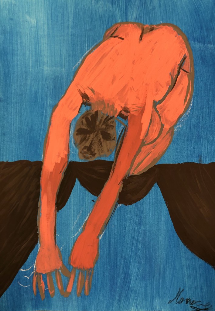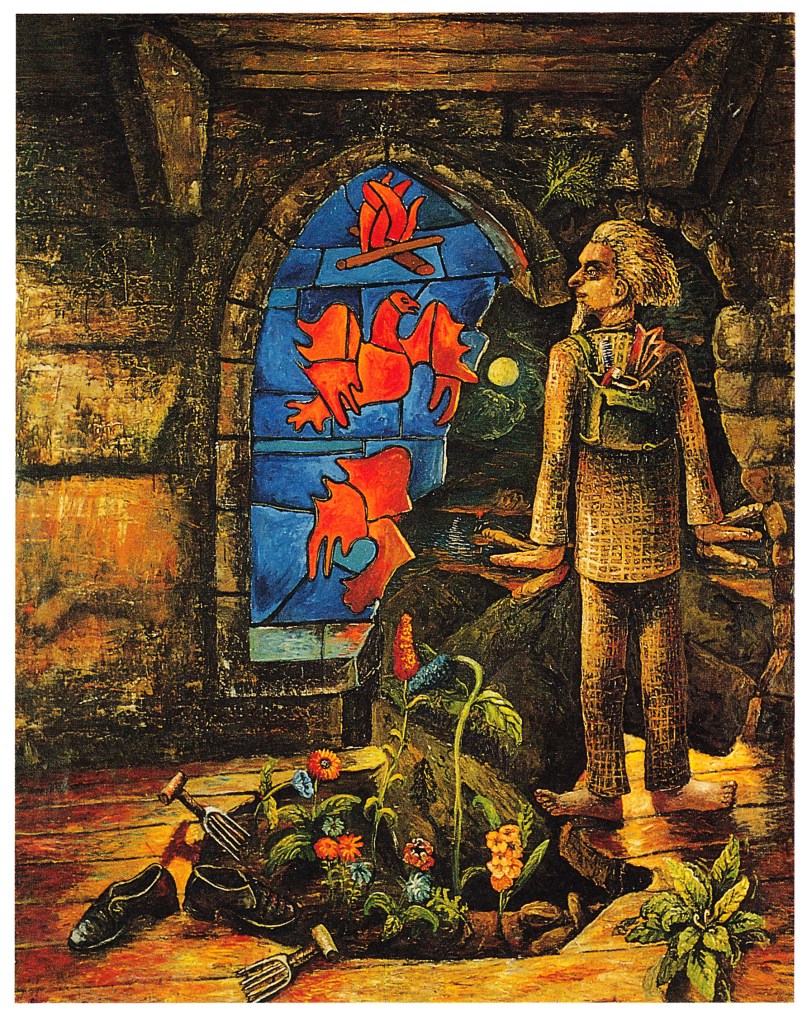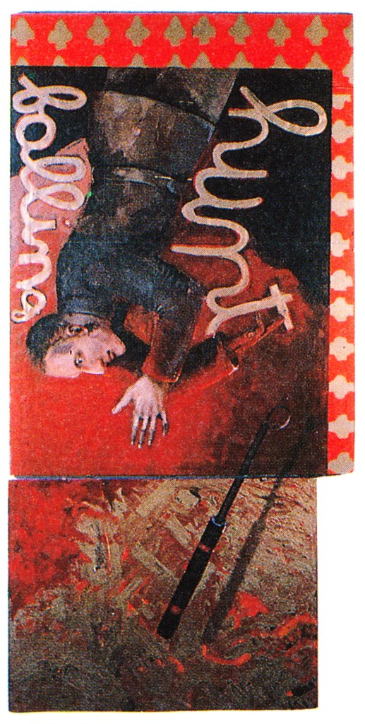 The above painting is called Hunt Falling. Falling is an in between state: you’re neither up nor down – and in a sense Hunt is always suspended like this, between good and evil. According to Campbell, Hunt got drawn into Nazi-ism because he was misguided, and his ‘Fall’ is his moral despair when he realizes, too late, his mistake.