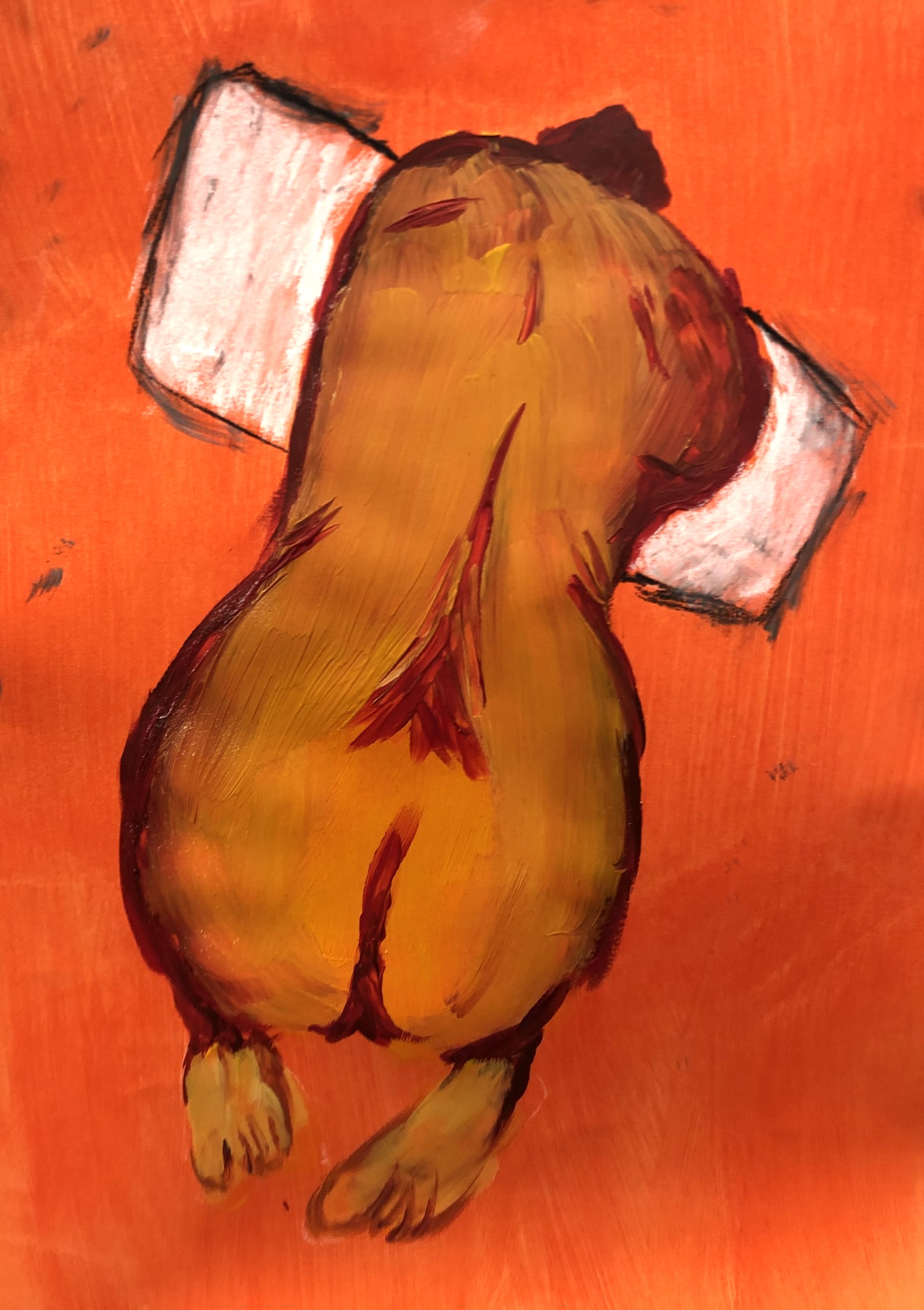 The detective crawling around on all fours in Poised Murder, transformed into other characters that he would use in his paintings: characters that are detectives, hikers, hunters and travellers, and are comparable to artists in the sense that they’re always searching or hunting for something, attempting to discover and unravel some sort of truth. Campbell liked to explore the role of the artist as detective, but like the detective in Poised Murder – crawling pointlessly around searching for clues and uncovering nothing while murders take place all around him – Campbell was very much aware of the often ridiculous, comedic and futile nature of such a grand search for truth. The predicaments his characters find themselves in in his work, reflects this.