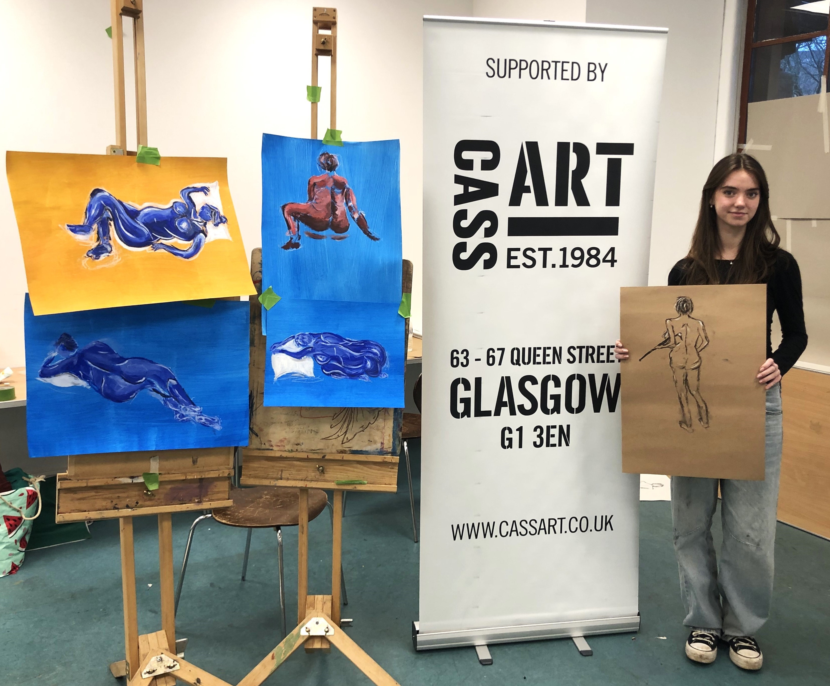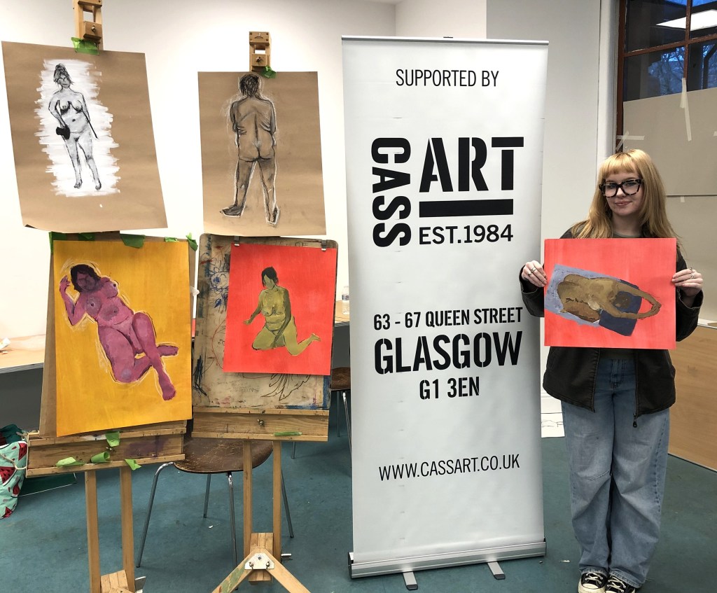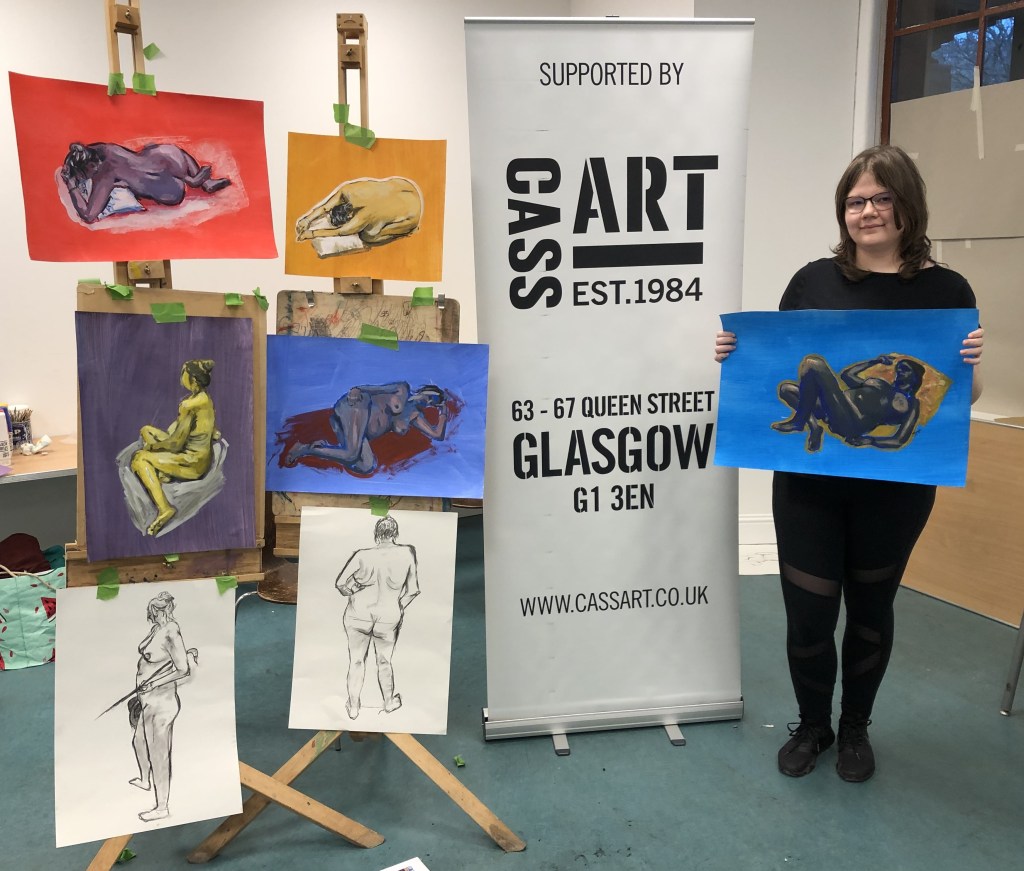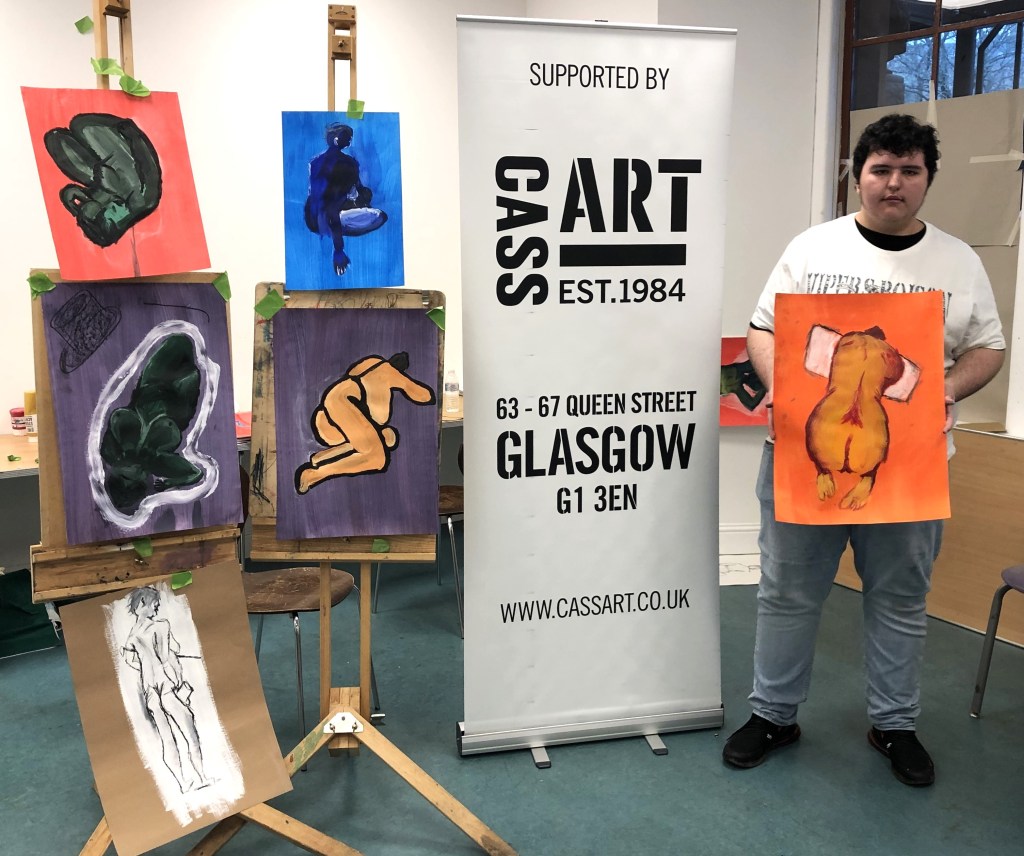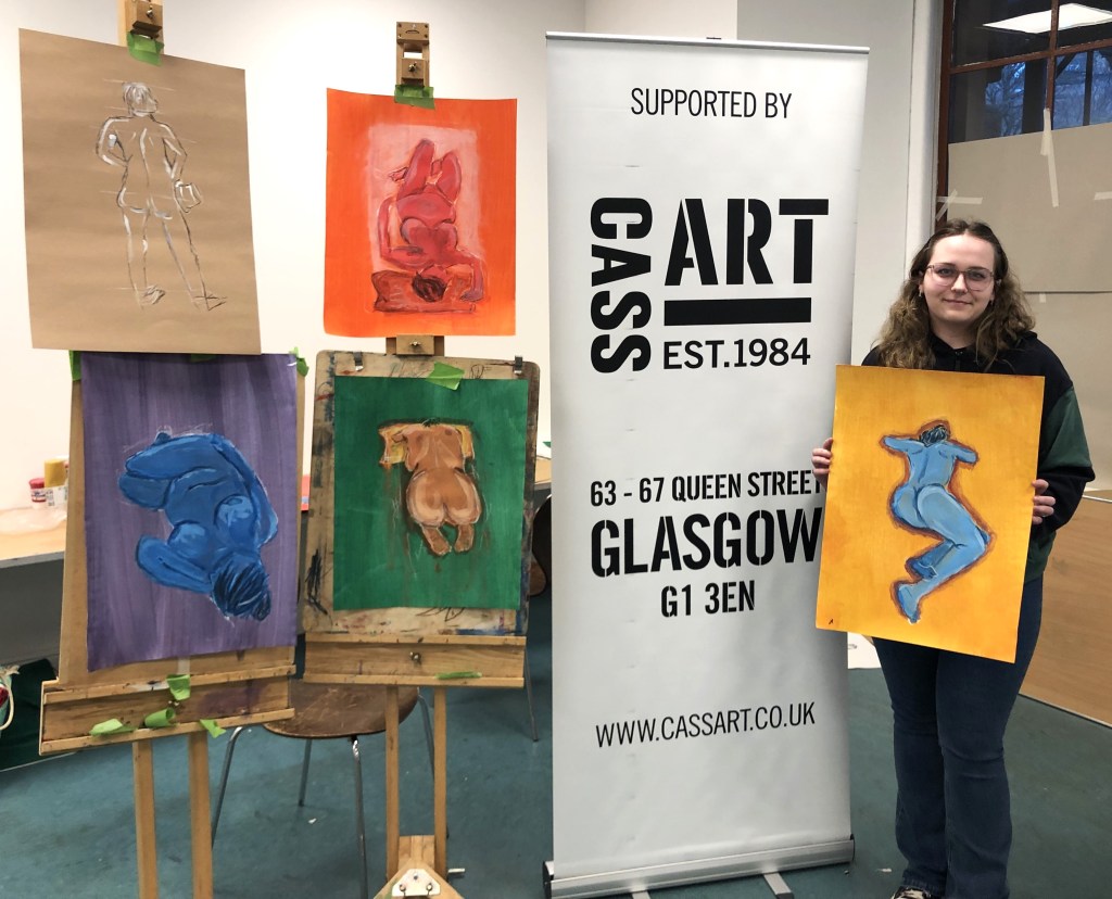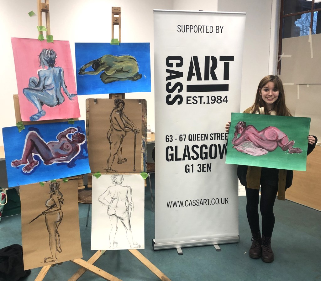 This year, artist Claire Paterson, former winner of the Hunt Medal presented by the Trust, led an intensive two-day life-painting workshop at the Kelvingrove Art Gallery and Museum for fifteen pupils from nine schools, including Balfron High School, Hyndland Secondary, Lourdes Secondary, St Mungo’s Academy, Kelvinside Academy, Drumchapel High School, Hutcheson’s Grammar School, St Andrew’s Secondary and Barrhead High School.