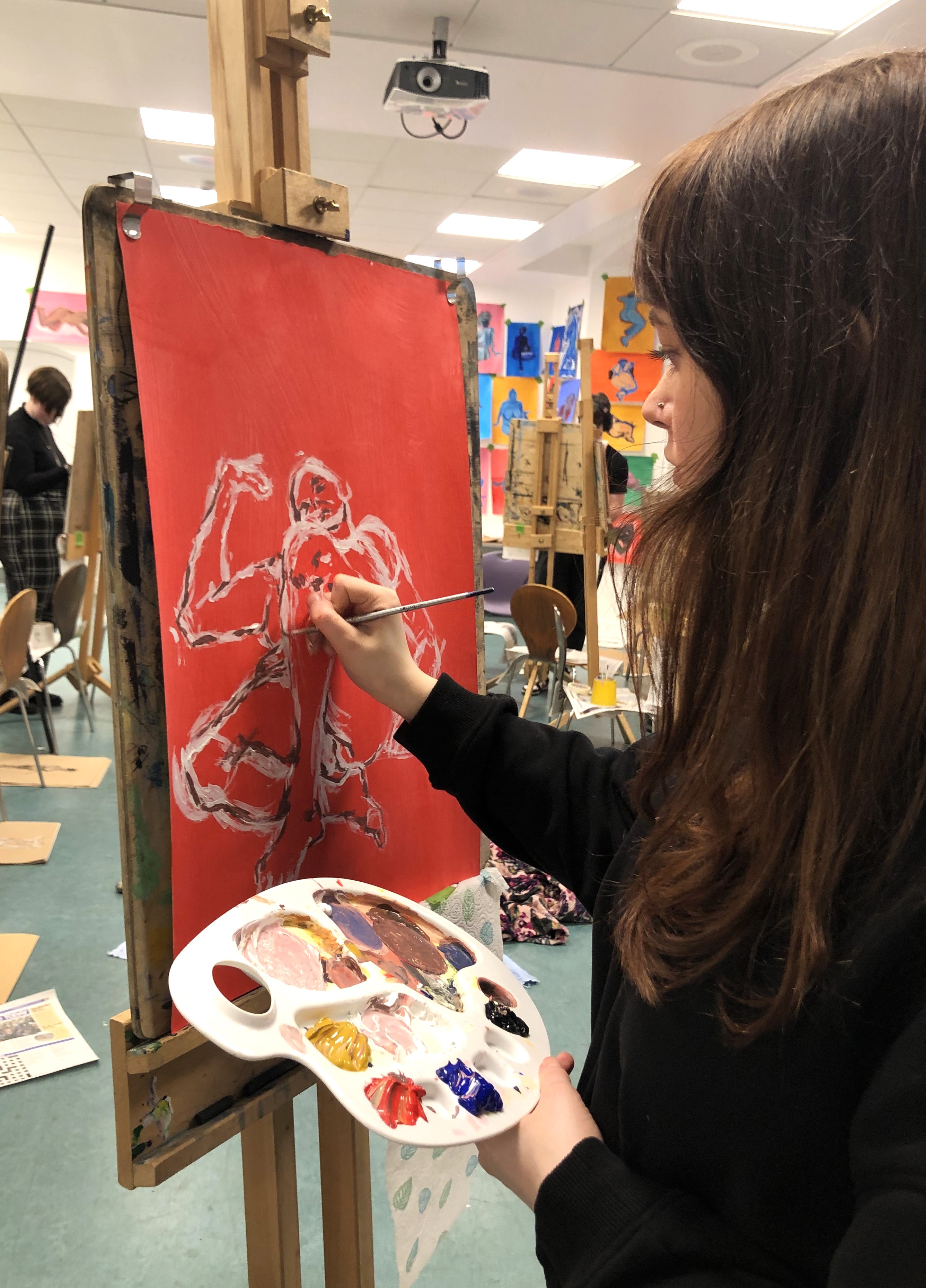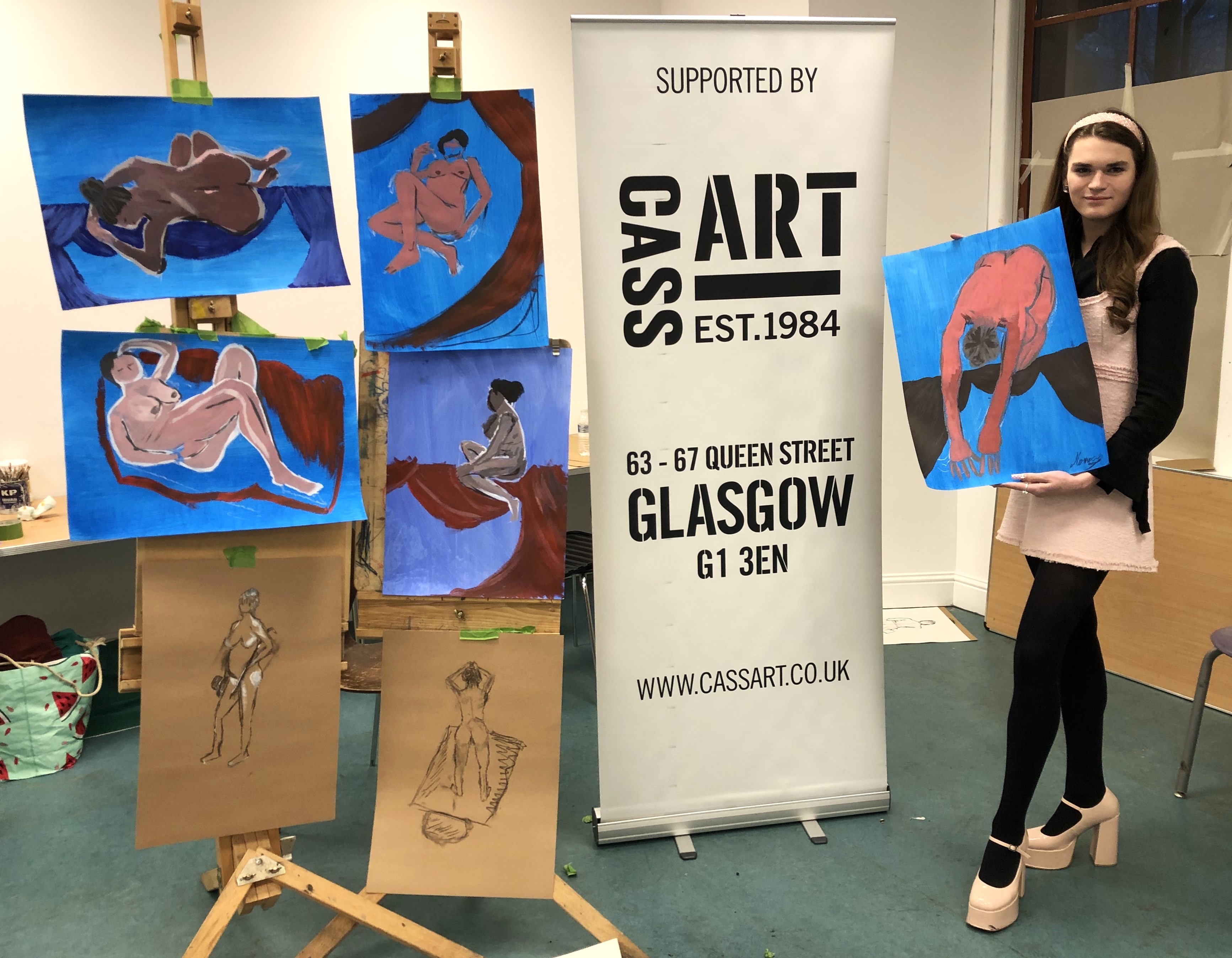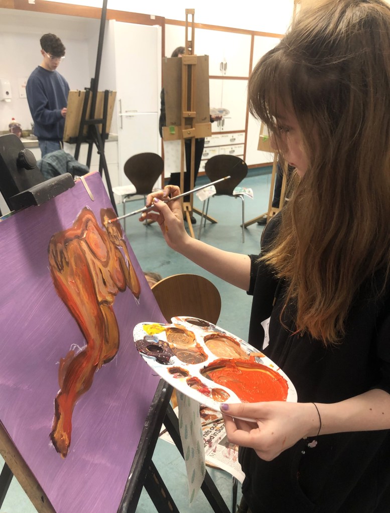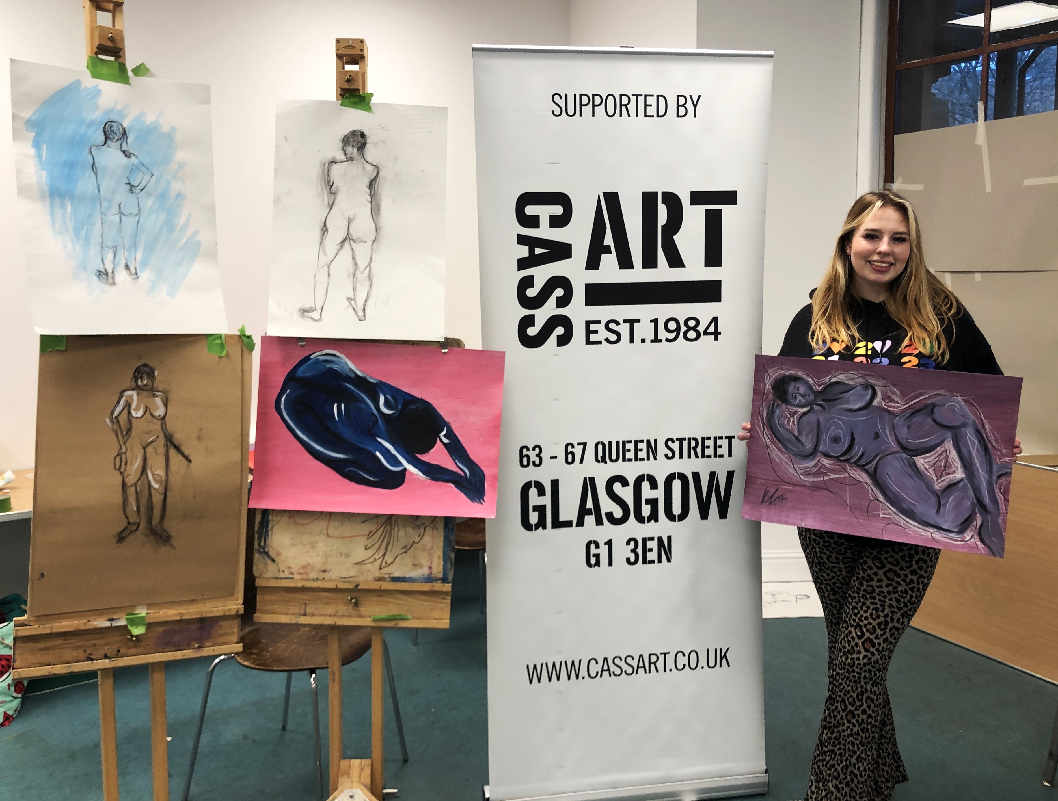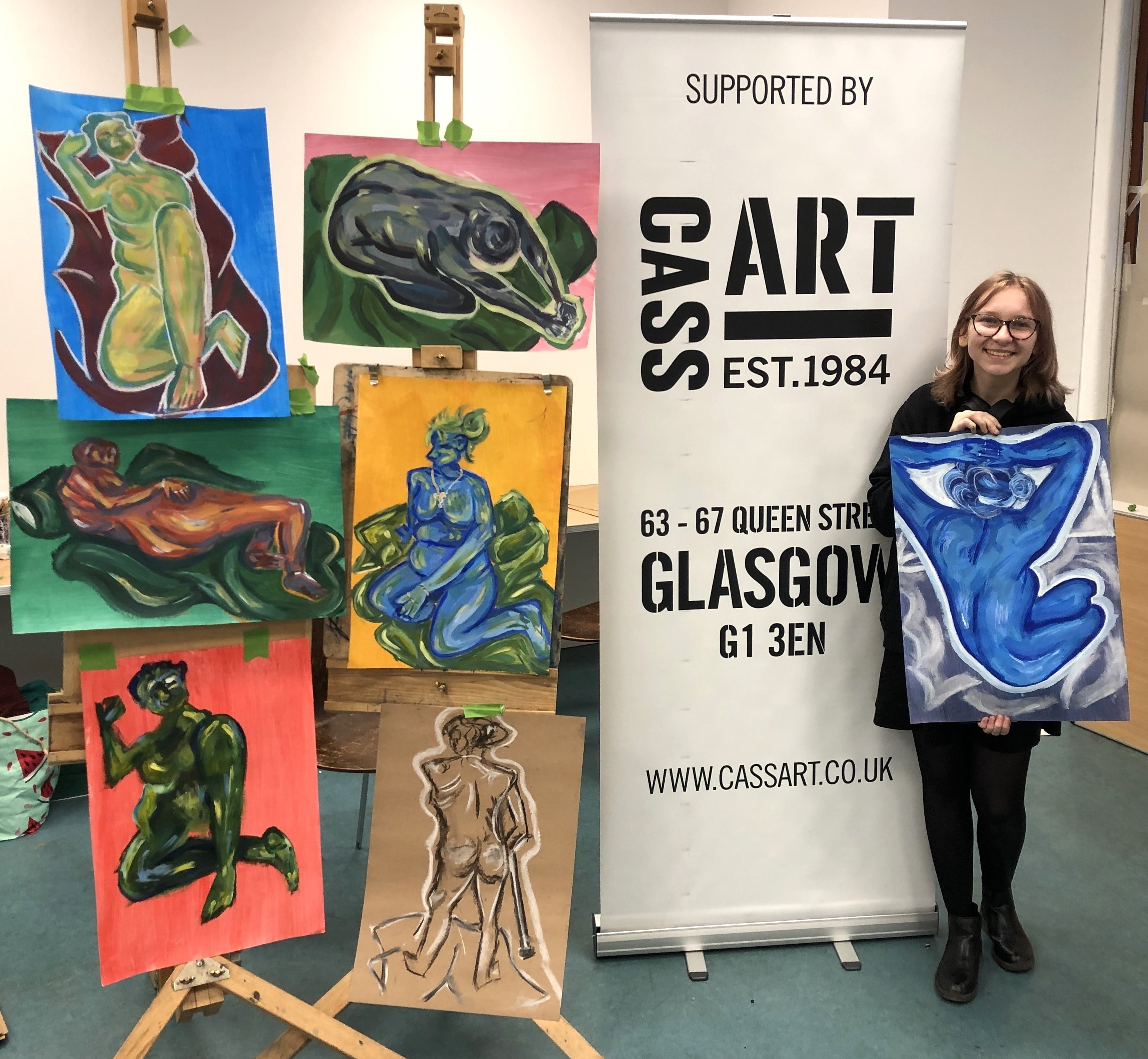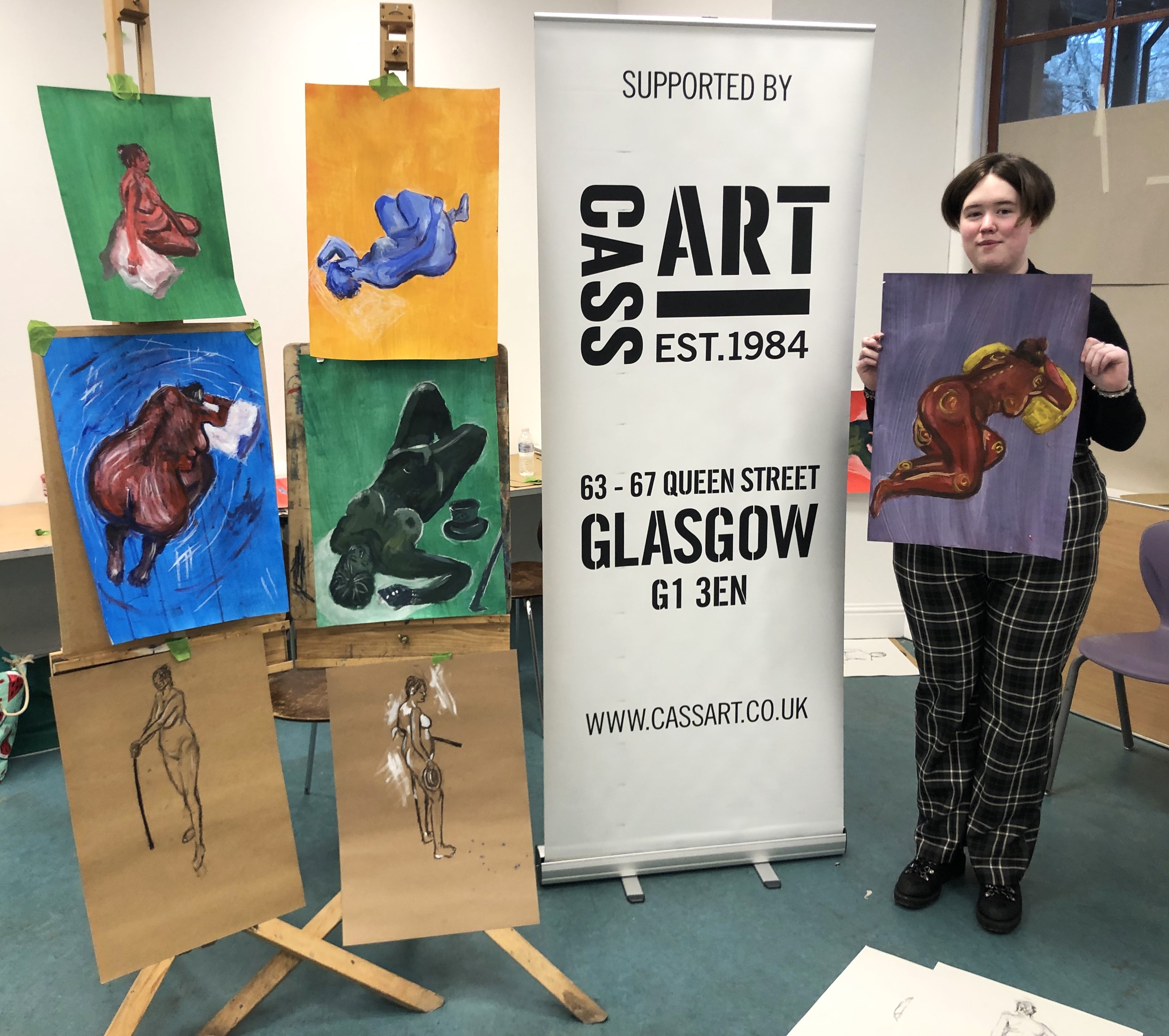 This year, artist Claire Paterson, former winner of the Hunt Medal presented by the Trust, led an intensive two-day life-painting workshop at the Kelvingrove Art Gallery and Museum for fifteen pupils from nine schools, including Balfron High School, Hyndland Secondary, Lourdes Secondary, St Mungo’s Academy, Kelvinside Academy, Drumchapel High School, Hutcheson’s Grammar School, St Andrew’s Secondary and Barrhead High School.