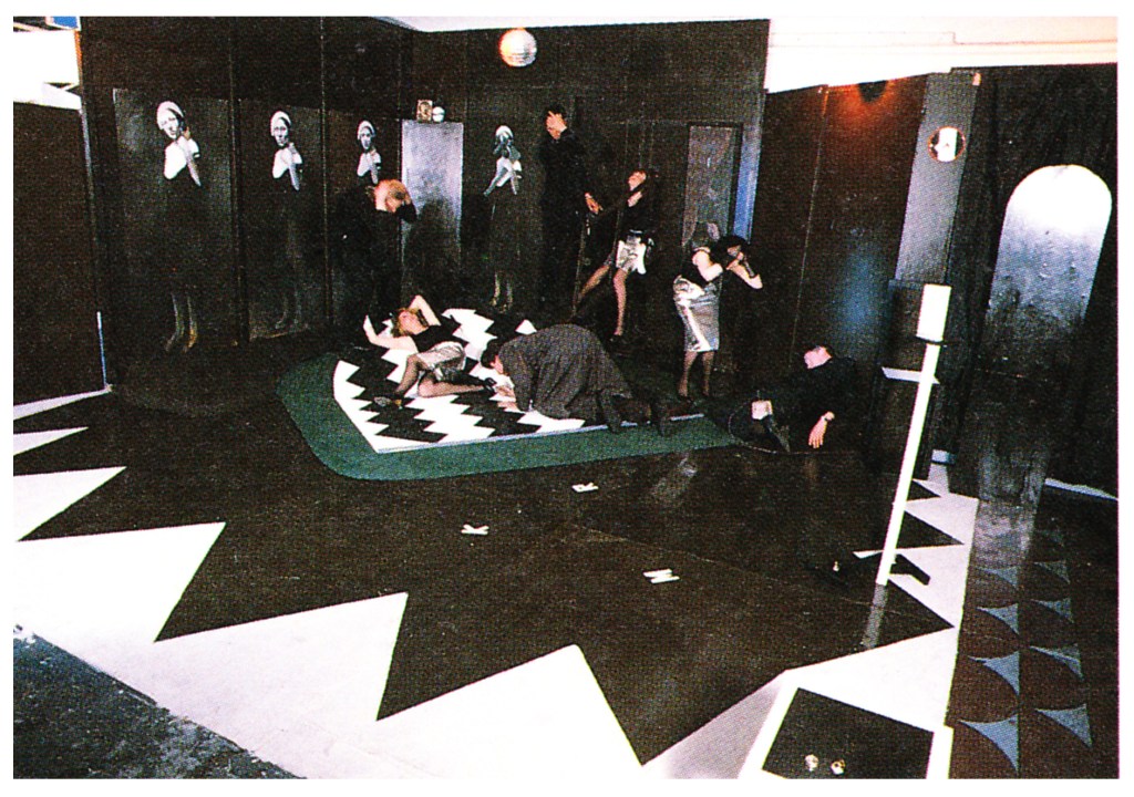 Since his time at the Glasgow School of Art, Campbell was deeply fascinated by the figure. One of the first ways he approached this, was through performance. Above is a photograph taken in 1981 of a performance called Poised Murder, in which Campbell created an artificial and stylized environment, based on the glamorous aesthetic of black and white Hollywood movies in the nineteen thirties and forties [3]. The actors in the performance dressed in clothes of this era: the men wearing black polo necks, medallions and Brylcreem in their hair; the women in silver skirts, fishnet tights and high heels.