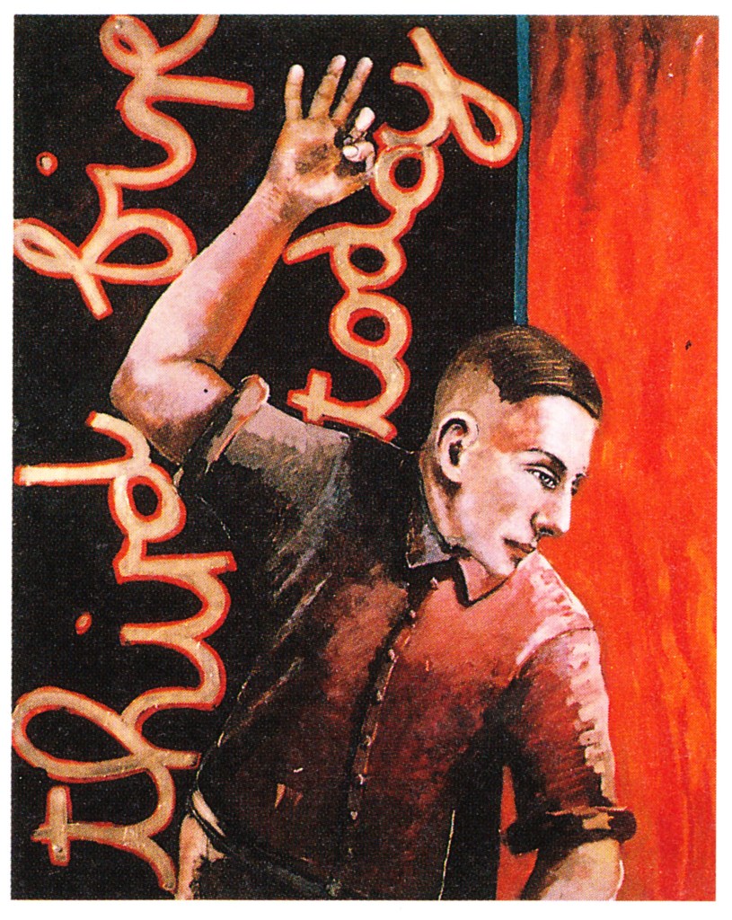 During his final year at the Glasgow School of Art, Campbell created a character called ‘Hunt’, inspired by a 1940s-style murder magazine [4]. Hunt is a very shady, ambiguous character, whose personality seems to be in a constant state of flux. The painting Third Fire Today shows Hunt standing on the edge of looting and violence, and we’re unsure whether he’s been participating or not. He’s dressed in a brown shirt – the uniform of a Nazi foot soldier. He’s also got a Hitler-style haircut, and we’re unsure what terrible crimes he may or may not have committed.
